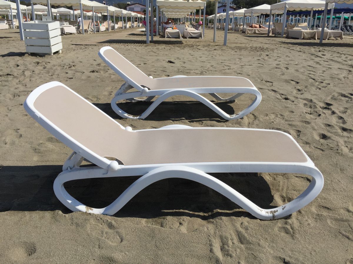 Шезлонг Omega Blue, от производителя Nardi - это хорошо зарекомендовавший себя как на зарубежных, так и на российских пляжах, крепкий, прочный и надежный. Его универсальный дизайн, с продуманной обтекаемой формой, которая убережет гостей от травм, очень зарекомендовала себя на рынке. Натянутая ткань, в основной зоне использования - это специально разработанная ткань, устойчивая к выгорания, гниению и устойчива к грязи. Шезлонг разработанный специально для коммерческих целей, где высокая проходимость посетителей и с возможностью использования спинки в нескольких положениях. Этот шезлонг использовать решили в двух цветах, с синей тканью и с бежевой. Посмотрим, какой себя покажет с лучшей стороны.